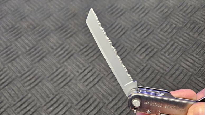 Le Supertool 300 embarque deux grandes lames de 8 cm, l’une lisse et l’autre dentelée. Leur taille est généreuse, comparable à celle du Surge, et permet de réaliser facilement des coupes dans le cordage, le carton ou le plastique. Elles sont tranchantes, robustes, et bénéficient d’un système de verrouillage sûr.