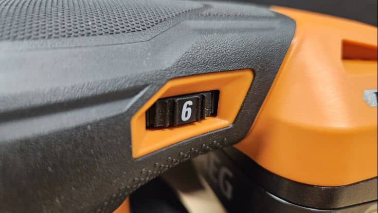 Lors de mes tests (avec disque grain 80), le ponçage était efficace dès la position 3. En position 6, la machine démontre toute sa puissance tout en maintenant un bon contrôle. Le régulateur de vitesse permet d’adapter la cadence au type de matériau ou à la finesse du travail souhaité.