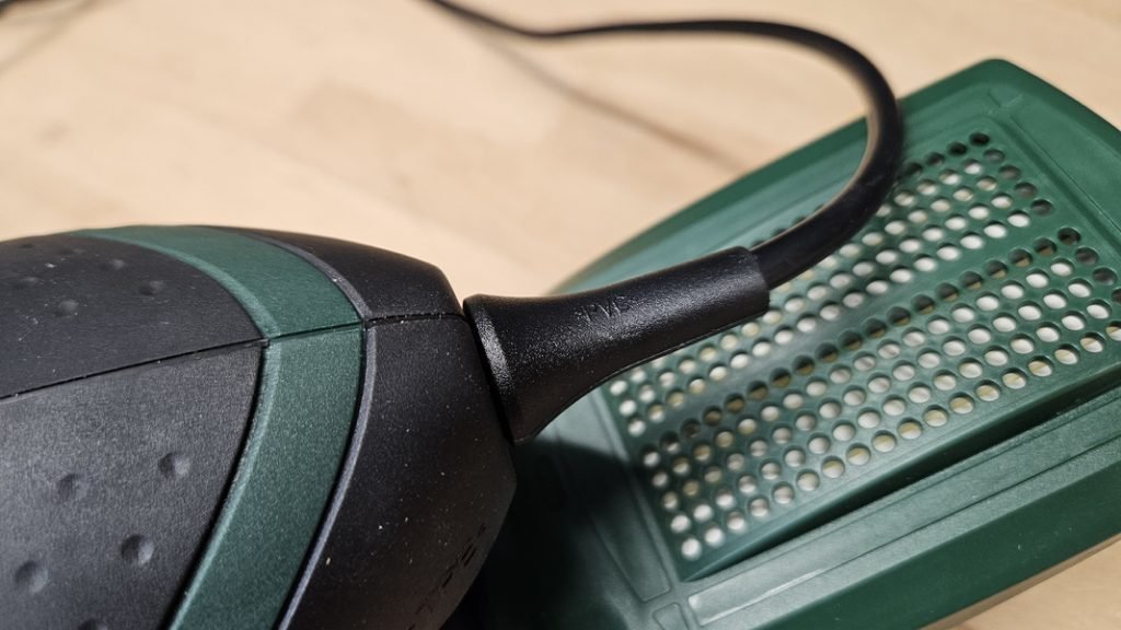 La Bosch PEX 220 A est équipée d’un moteur à charbon de 220 W, une puissance suffisante pour les petits et moyens travaux de ponçage. La vitesse d’oscillation atteint 24 000 oscillations par minute, tandis que l’amplitude du mouvement est de 2,5 mm. Ce duo permet un travail régulier et homogène, idéal pour des finitions soignées. Alimentée par un câble de 2,5 m, elle offre une bonne liberté de mouvement, d’autant que le cordon est renforcé à sa base pour éviter les risques de rupture, un point souvent négligé sur les modèles d’entrée de gamme.
