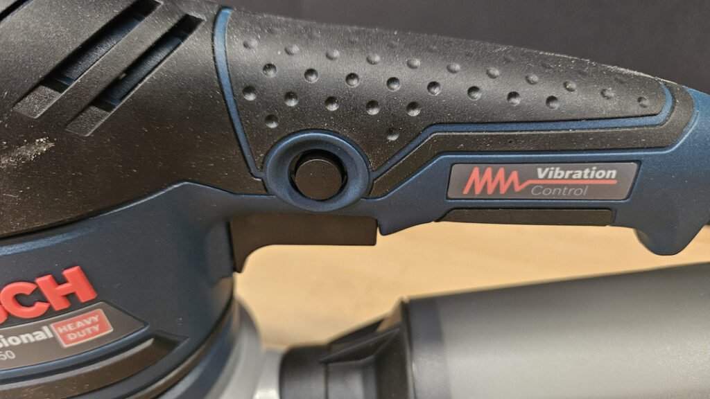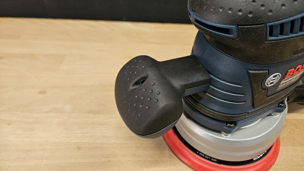 Avec 2,4 kg, la machine n’est pas légère, mais ce poids se justifie par un ensemble robuste et stable. En pratique, sur une surface horizontale, le support reprend l’essentiel de la charge et la ponceuse est parfaitement stable, ce qui aide à garder une trajectoire régulière. L’ergonomie est un point fort, avec notamment une poignée principale avec grip, une gâchette bien placée, un bouton de blocage pour maintenir la mise en route, un large pommeau supérieur également gainé, et une poignée secondaire amovible pour travailler à deux mains. Cette multiplicité de prises améliore le contrôle, notamment en bord de pièce ou lors des phases où l’on cherche à limiter les marques de reprise.