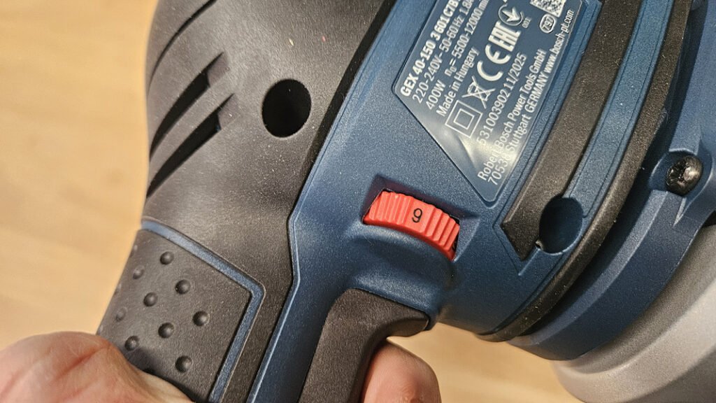 Le moteur de 400 W place la GEX 40-150 au-dessus des ponceuses excentriques plus compactes, avec de plus une vitesse variable de 11 000 à 24 000 oscillations/min et une amplitude (excentricité) de 4 mm. L’association puissance, vitesse élevée et amplitude permet un enlèvement de matière rapide, surtout avec un abrasif adapté.