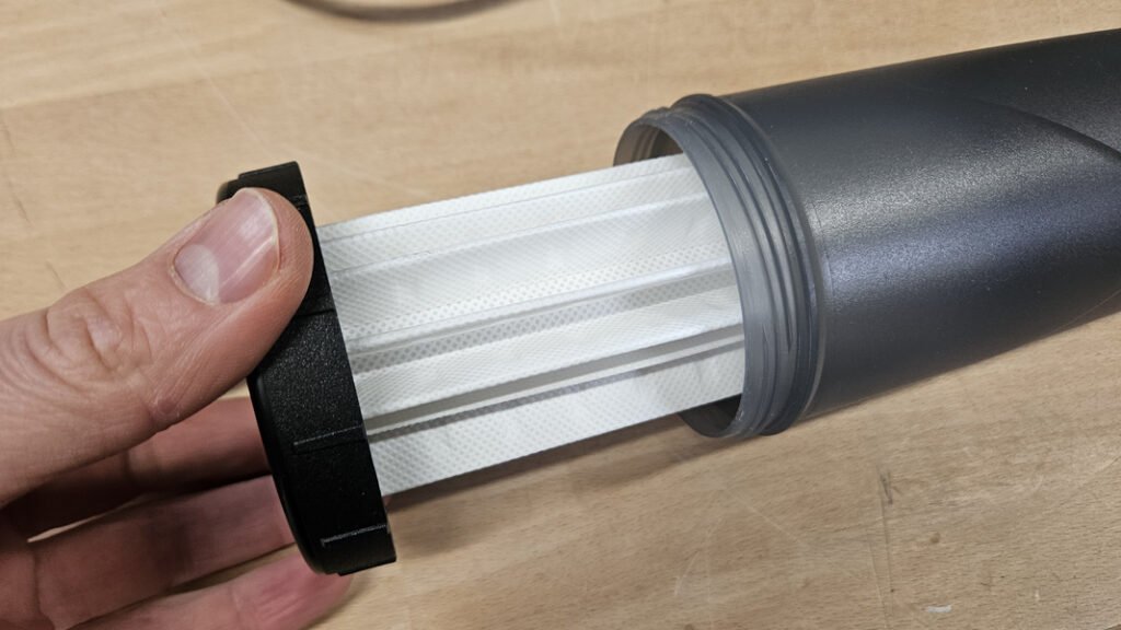 La machine est livrée avec un récupérateur de poussières assez imposant, intégrant un filtre. Il se démonte facilement pour être vidé, ce qui permet de maintenir un niveau d’aspiration correct lors des sessions de ponçage. Il est également possible de retirer ce récupérateur pour raccorder un aspirateur de chantier, avec un adaptateur à prévoir.