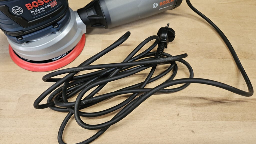 Cette ponceuse est un modèle filaire, équipée d’un câble de 4 m, ce qui offre une mobilité correcte sur établi et autour d’une pièce sans multiplier les rallonges. La zone de raccordement est de plus renforcée, afin d’augmenter la durée de vie de la machine.