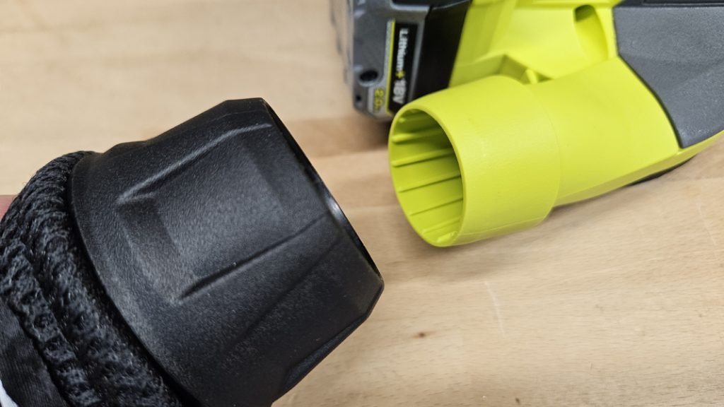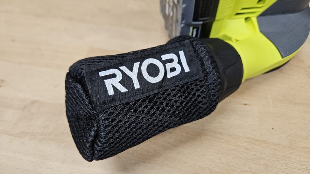 Ryobi fournit un sac de récupération, capable de retenir une bonne partie des poussières générées. Pour un travail prolongé ou plus propre, il est possible de raccorder un aspirateur directement sur la sortie prévue à cet effet. Le plateau est quand à lui perforé de 8 trous, ce qui offre une aspiration efficace.