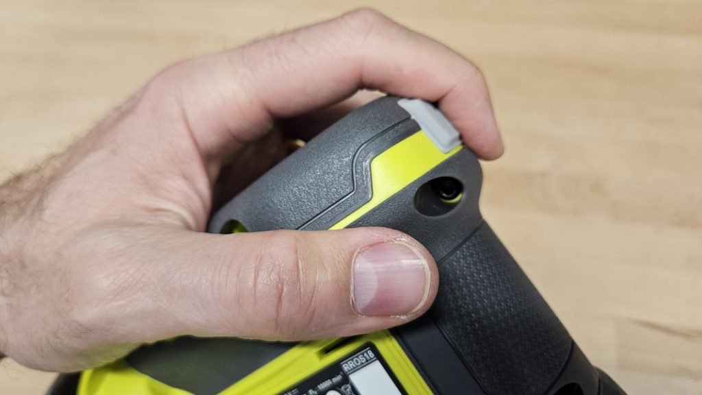 Compacte et bien équilibrée, la RROS18-0 ne pèse que 1,155 kg sans batterie. Sa poignée en forme de champignon et recouverte de grip offre une excellente tenue, que ce soit à une ou deux mains. Le bouton de mise en marche tombe parfaitement sous les doigts, et l’arrêt du moteur est franc, ce qui facilite le contrôle durant toute la durée du ponçage. Son niveau sonore reste dans la moyenne des ponceuses excentriques, permettant un travail malgré tout confortable.