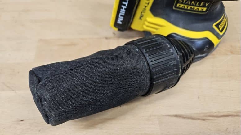 La machine est livrée avec un récupérateur de poussière qui se fixe à l’arrière du carter. Ce dernier permet de limiter la dispersion des résidus lors du ponçage, tout en restant compact. Pour les utilisateurs disposant d’un aspirateur d’atelier, il est également possible de brancher un tuyau d’aspiration à la place du récupérateur, ce qui améliore nettement l’efficacité d’aspiration.