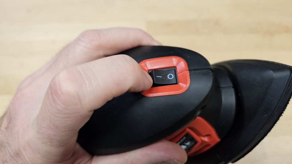 Le bouton d’alimentation, situé à portée de doigt, est facilement accessible, permettant de contrôler la machine d’une seule main. Le centre de gravité bien placé et le faible niveau de vibration contribuent au confort d’utilisation. En pratique, cette ponceuse se montre agréable à manier sur de longues sessions, notamment pour les petites finitions ou les recoins difficiles d’accès.