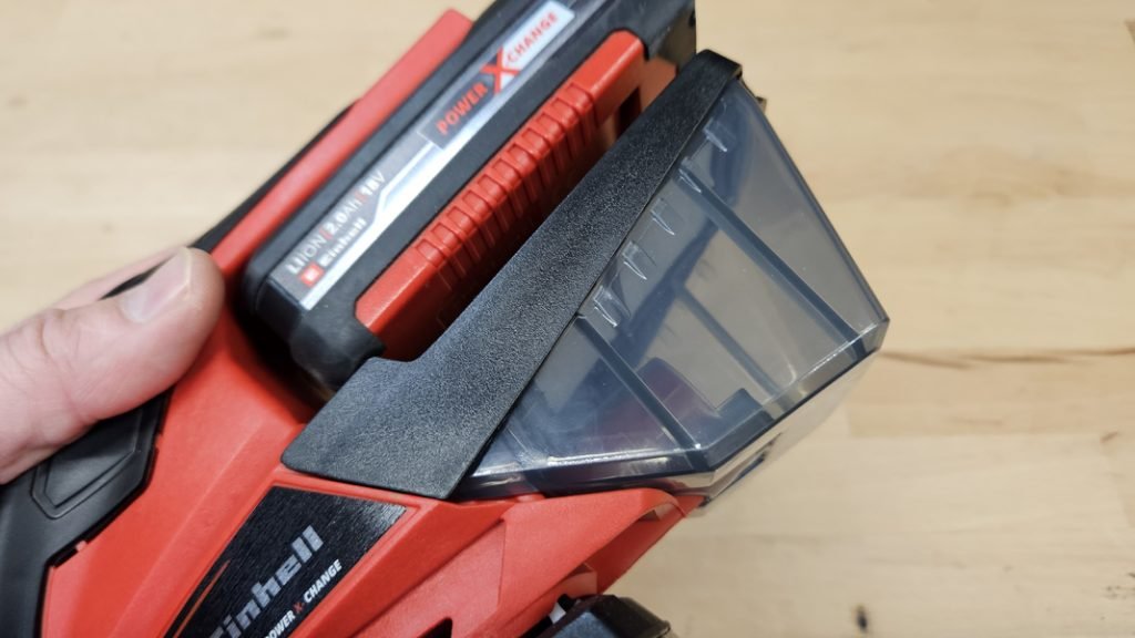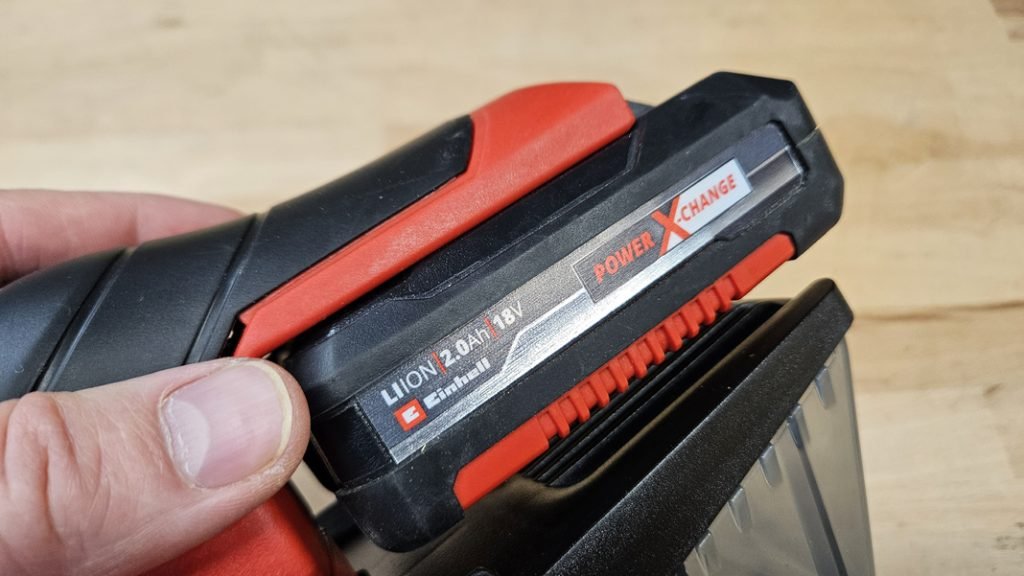 Comme je viens de le mentionner, la TE-OS 18/150 Li fonctionne avec les batteries 18V Einhell Power X-Change, comme l’ensemble des autres outils 18V de la gamme. Même si la machine accepte toutes les batteries 18V, il faut noter que les modèles de 5 Ah ou 6 Ah ne peuvent être utilisés que si le collecteur de poussière est retiré. Dans cette configuration, l’outil devient un peu moins compact, mais l’autonomie est prolongée de manière significative.