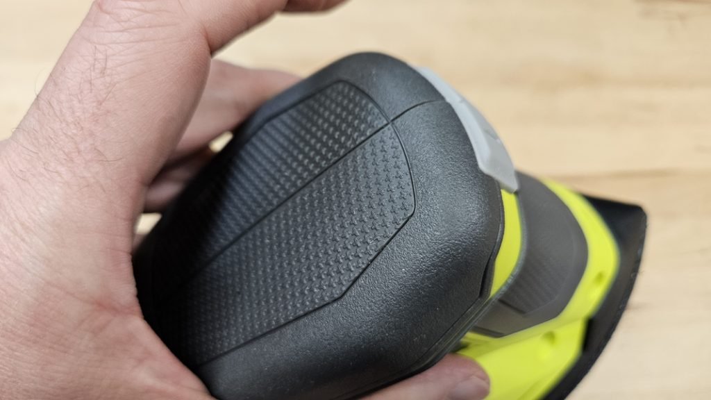 Sur cette ponceuse, Ryobi a opté pour un moteur à charbon, simple mais éprouvé. Cette machine délivre de plus une vitesse d’oscillation de 22 000 oscillations par minute, avec une amplitude de 1,8 mm, ce qui représente des valeurs dans la moyenne haute de cette catégorie d’outils. Cela garantit un bon rendement, notamment sur le bois ou les peintures anciennes. La ponceuse ne dispose malheureusement pas d’un variateur de vitesse, mais il ne faut pas trop en demander pour une machine à ce niveau de prix.