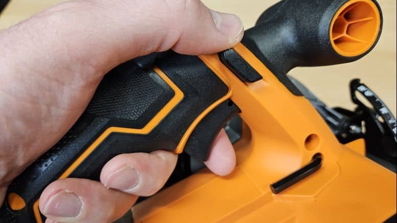 Avec un poids de 1,146 kg sans batterie, la machine est légère et facile à manier. La poignée principale est équipée d’un grip confortable, avec une gâchette sécurisée nécessitant un appui simultané sur un bouton de déverrouillage, ce qui limite les risques de démarrage involontaire.