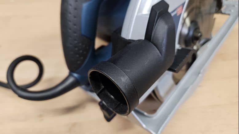 La scie circulaire est équipée d’un conduit pour raccord d’aspiration. Il permet soit d’évacuer les copeaux vers l’arrière, soit de connecter un aspirateur pour maintenir une zone de coupe propre et améliorer la visibilité pendant le travail. Cette fonctionnalité est particulièrement utile en intérieur ou pour les coupes longues.