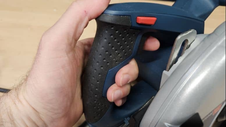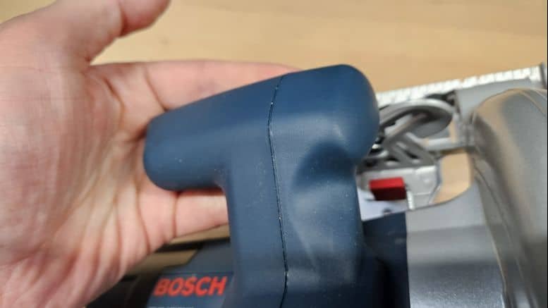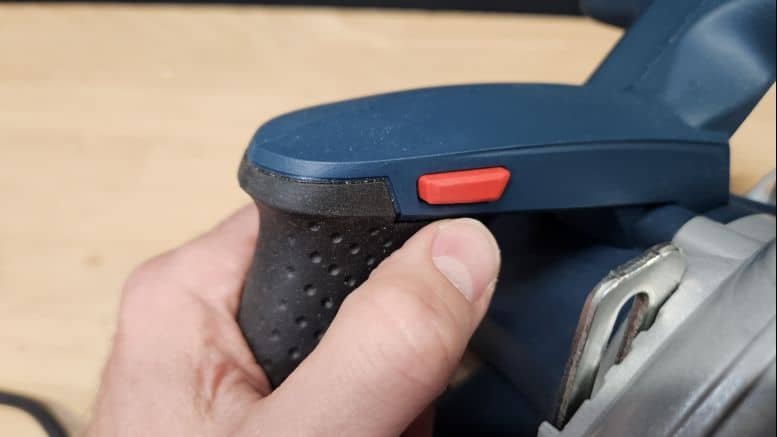 Avec un poids de 4,8 kg, la scie est relativement lourde. Mais dans le cadre d’une scie circulaire de ce calibre, c’est acceptable puisque le poids repose en grande partie sur le matériau. La poignée principale est bien conçue, avec un revêtement grip agréable et une gâchette de sécurité bien placée.