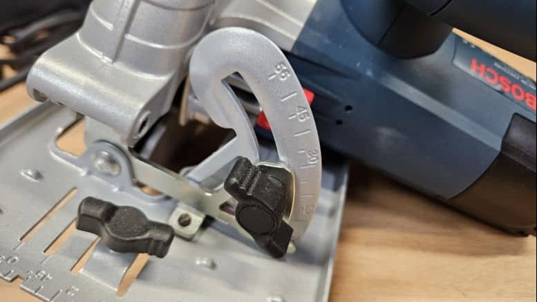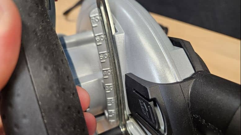 La profondeur de coupe se règle facilement à l’arrière de la machine, via un levier rapide et une graduation bien visible. Le réglage de l’angle d’inclinaison peut aller jusqu’à 56°, ce qui offre une bonne flexibilité pour les coupes en biais. Les deux systèmes de réglage sont intuitifs, rapides et robustes.