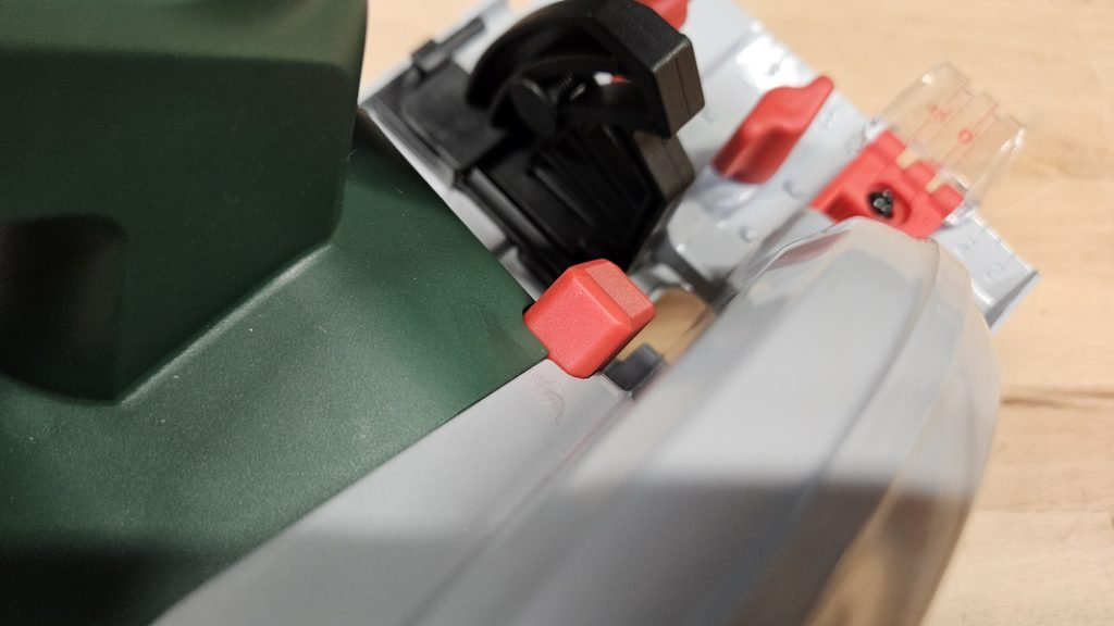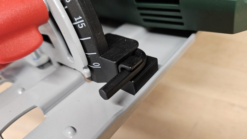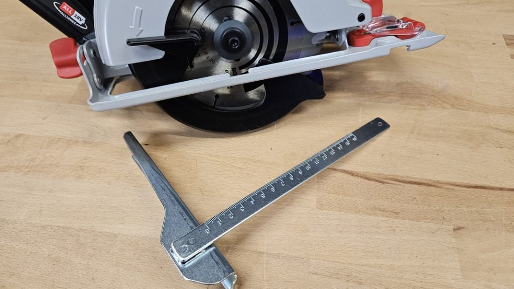 Cette scie intègre de plus un guide de visée repliable, placé à l’avant de la lame, avec double repère 0°/45°. Ce petit accessoire est très utile, puisqu’il permet de suivre un trait sans rail. Pour les coupes parallèles, un guide est aussi fourni, ce qui permet de réaliser des coupes précises, si bien entendu le bord de référence est bien droit.