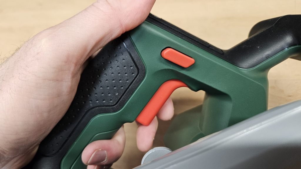 Avec ses 2,98 kg sans batterie, cette scie n’est pas la plus légère du marché, mais cela ne gène en rien la coupe, puisque le poids repose essentiellement sur la semelle pendant la coupe. La poignée principale avec grip tombe bien sous la main, la gâchette est large et un bouton de sécurité évite tout démarrage involontaire. La poignée avant stabilise l’avance et améliore le contrôle à deux mains.