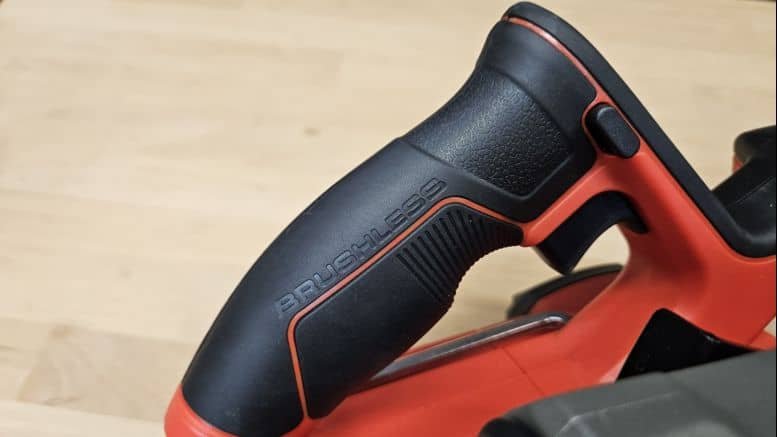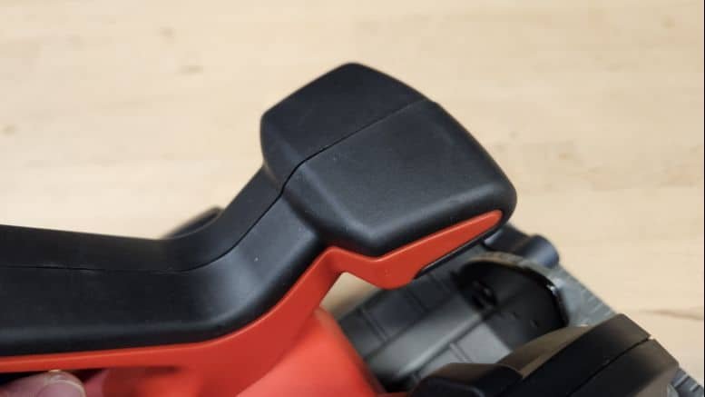La scie Einhell pèse 3,3 kg sans batterie, un poids correct pour une machine équipée d’une lame de 190 mm. La poignée principale est recouverte d’un grip souple et agréable, tandis qu’une poignée secondaire assure un bon maintien à deux mains. Le bouton de sécurité permet de prévenir tout démarrage accidentel : il faut l’actionner avec le pouce avant de presser la gâchette, ce qui renforce la sécurité à l’usage.