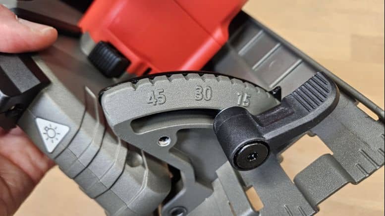 Les réglages d’angle et de profondeur de coupe sont classiques mais efficaces. Un levier permet de régler l’inclinaison jusqu’à 45°, avec des crans repères à 15, 30 et 45°. La profondeur de coupe se règle facilement à l’arrière, avec des graduations visibles pour plus de précision. Le guide de coupe visuel sur la semelle permet de suivre un tracé manuellement, ou d’utiliser le guide parallèle fourni pour des coupes droites le long d’un bord.