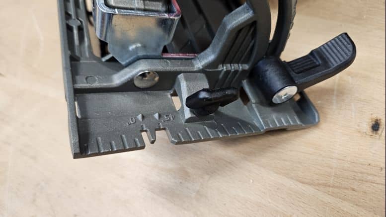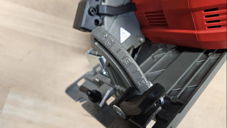La scie Einhell TP-CS 18/165 Li propose des réglages simples et accessibles, adaptés à une utilisation intuitive. Le réglage de l’angle de coupe s’effectue en libérant la semelle grâce à un levier situé à l’avant. Des repères gravés facilitent les coupes jusqu’à 45°.