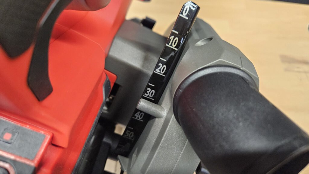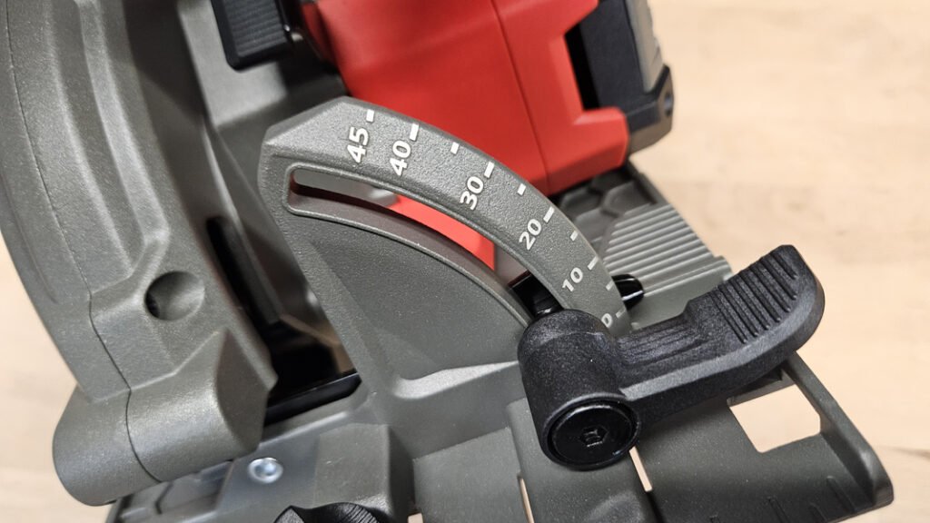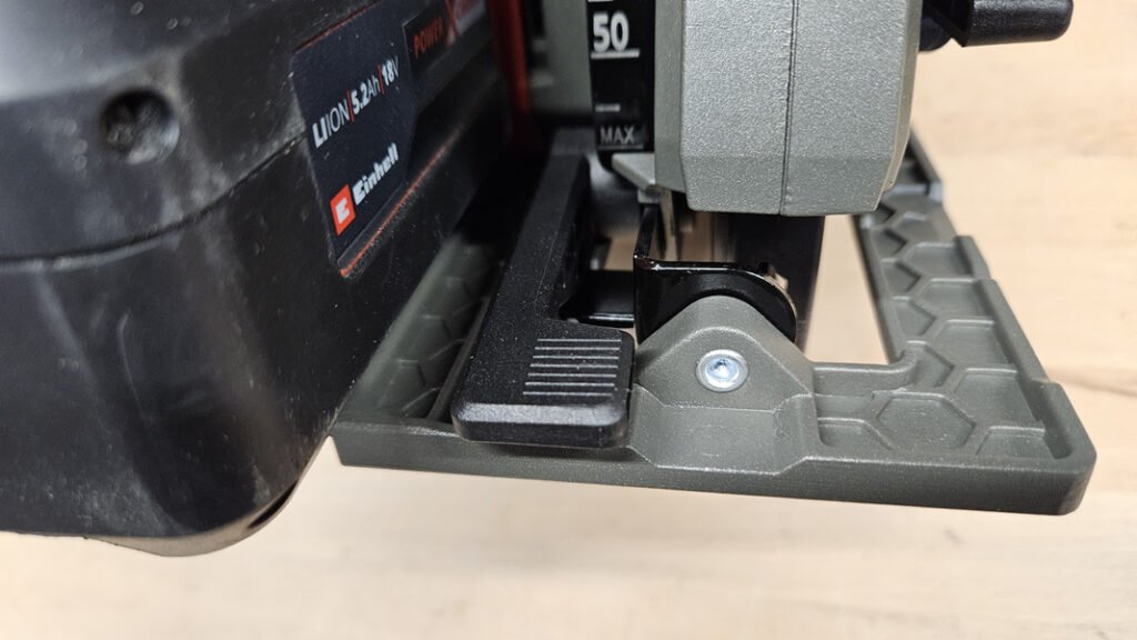 Les réglages sont simples, efficaces, et typiques d’une circulaire, puisque l’on retrouve à l’avant le levier pour régler l’inclinaison de la semelle afin de réaliser des coupes en biais. Le système est classique, rapide, et suffisamment précis pour un usage bricolage. À l’arrière, un levier permet de régler la profondeur de coupe. On retrouve un marquage clair, qui aide à régler rapidement la profondeur souhaitée.