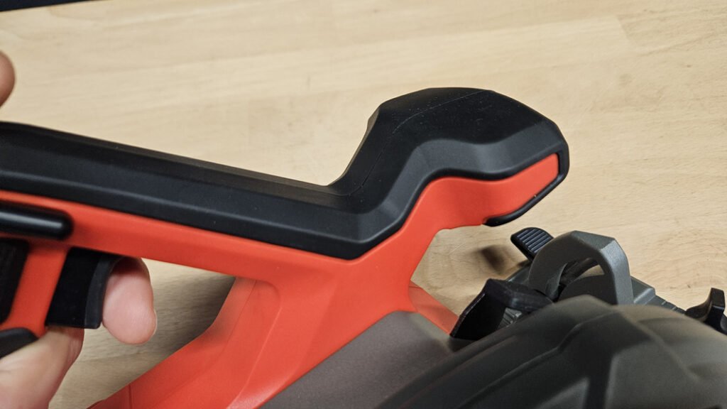 La poignée principale est recouverte d’un grip efficace, avec une bonne accroche même avec des gants. La gâchette tombe naturellement sous l’index et le bouton de sécurité est bien placé, ce qui limite les démarrages accidentels. C’est un point essentiel, puisqu’une scie circulaire reste un outil dangereux, et le fait d’avoir une commande sécurisée, intuitive, c’est un vrai plus au quotidien. La poignée avant permet de guider la scie à deux mains, ce qui améliore nettement la précision, surtout sur les coupes longues.