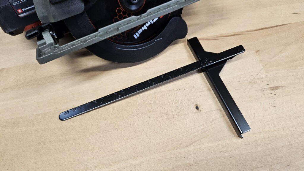 Le pack, dans la plupart des offres, est vendu nu, cela veut dire pas de batterie, pas de chargeur. En revanche, on retrouve l’essentiel pour l’usage, à savoir une lame de 165 mm prémontée, le guide parallèle (pratique pour couper le long d’un chant), le conduit d’aspiration, ainsi que la clé de service. Si vous êtes déjà dans l’écosystème Power X-Change, c’est idéal : vous investissez uniquement dans la machine. Si vous débutez chez Einhell, il faut bien intégrer le coût d’une batterie 4/5 Ah et d’un chargeur au budget.