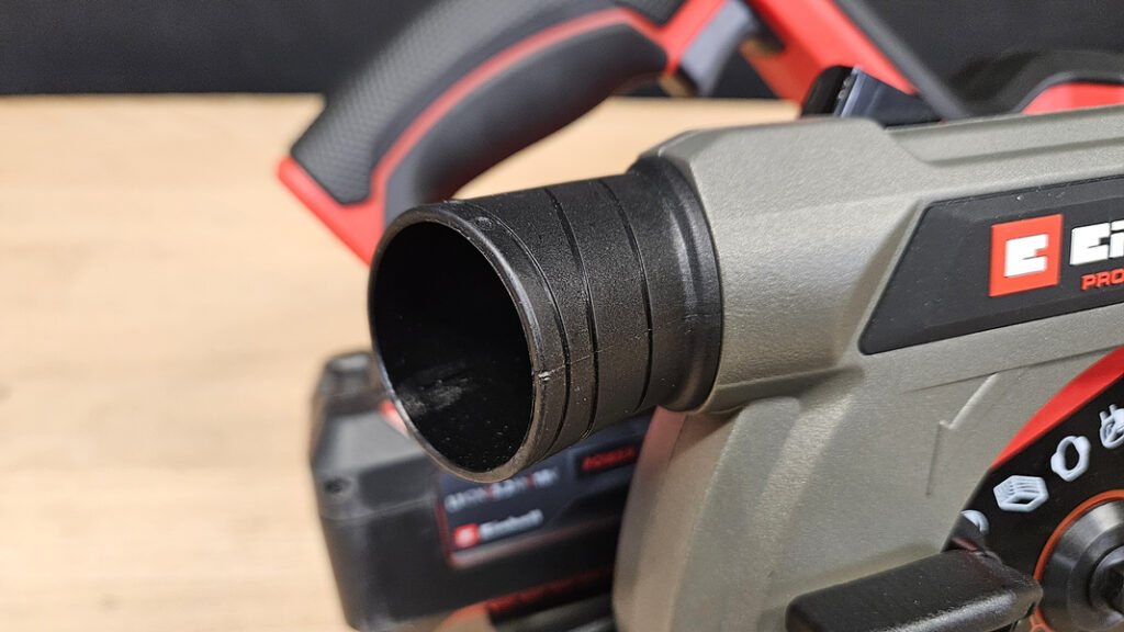 La scie est équipée d’un conduit d’évacuation des copeaux orientable, et il est possible d’y raccorder un aspirateur. Sur ce point, on gagne immédiatement en visibilité sur le trait de coupe, et l’environnement reste plus propre. C’est aussi un élément de confort si vous travaillez en intérieur ou dans un atelier.