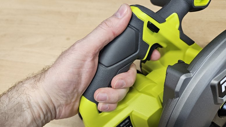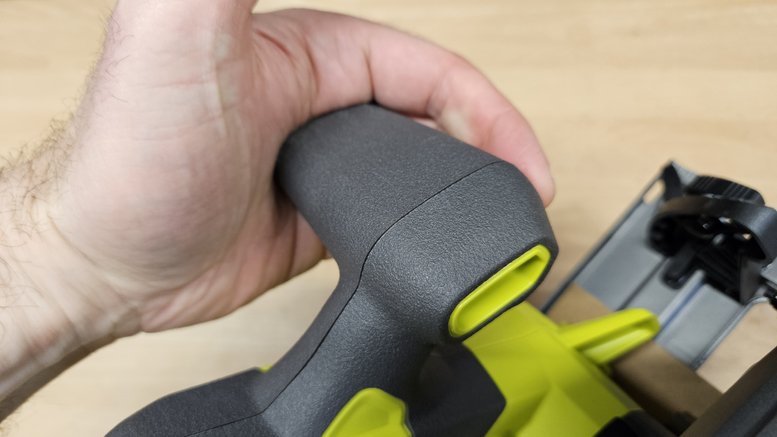 La prise en main est plutôt bonne grâce à deux poignées recouvertes de grip. La poignée principale est ergonomique, avec une large gâchette et un bouton de sécurité bien positionné. La poignée secondaire offre un bon appui pour guider la scie avec précision.