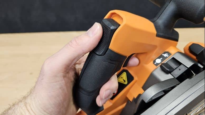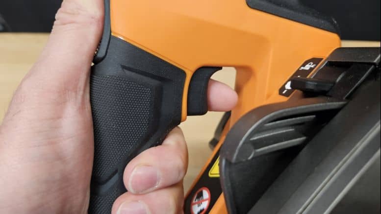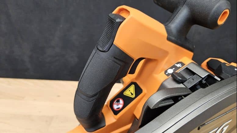 Avec un poids de 4,1 kg, cette scie reste relativement lourde pour un outil sans fil, mais l’ergonomie compense largement : deux poignées recouvertes de grip, une gâchette de sécurité bien placée, et une bonne répartition des masses.