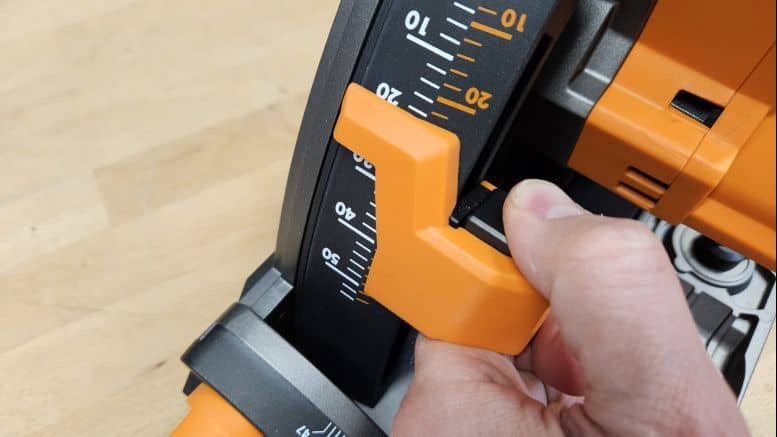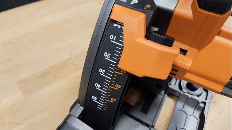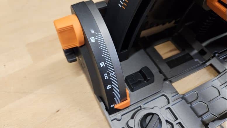 La machine propose des réglages de profondeur précis avec graduation millimétrée (avec/sans rail), et une inclinaison doublement verrouillée à l’avant et à l’arrière, pour une coupe stable et réglable facilement. Les crans d’ajustement sont francs, ce qui permet des réglages fiables et reproductibles.