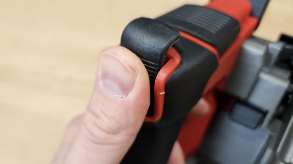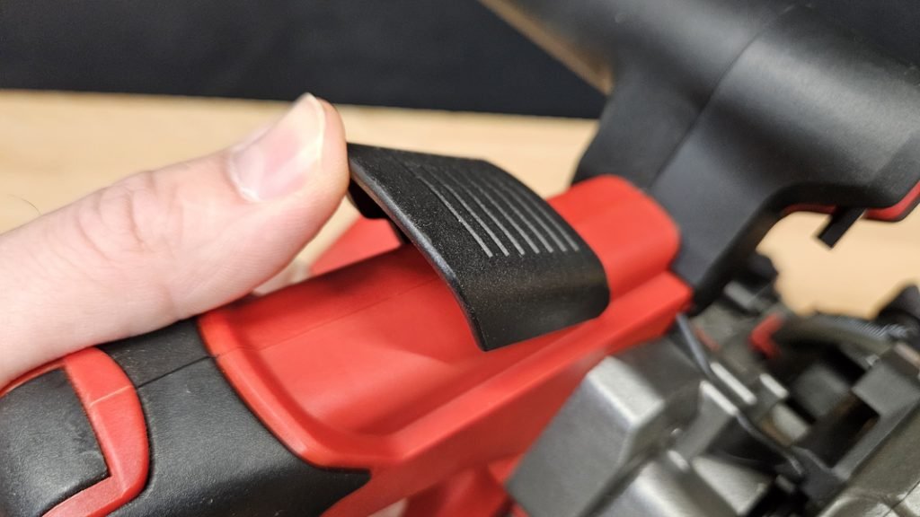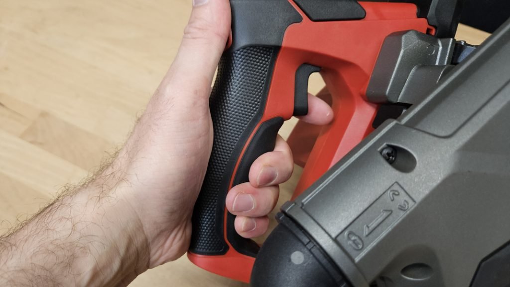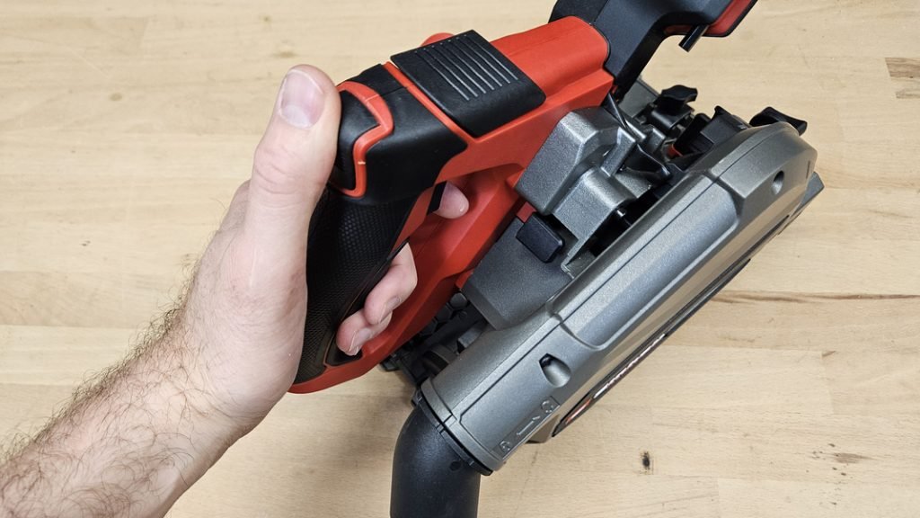 Malgré un poids un peu élevé (4,23 kg), la prise en main reste excellente grâce à une poignée principale recouverte de grip antiglisse et d’une poignée secondaire bien positionnée. Le bouton de sécurité, indispensable sur ce type de machine, évite tout déclenchement accidentel. Le contrôle pendant la coupe est bon, la scie restant stable, même en coupe à main levée sans rail.