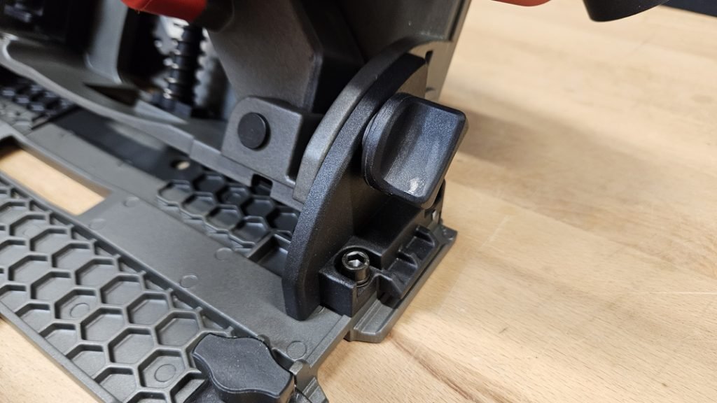Cette scie propose un réglage de profondeur précis, avec deux jauges : l’une pour une utilisation avec rail de guidage, l’autre sans. Elle permet également de régler l’angle de coupe jusqu’à 45° avec deux molettes de serrage, à l’avant et à l’arrière de la semelle. L’ensemble est facile à ajuster et reste bien verrouillé une fois en place.