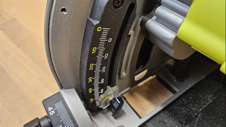 Les réglages sont simples, précis et bien pensés. Pour l’angle de coupe, un axe double avec graduation visible et crans de positionnement permet d’aller jusqu’à 48°. Pour la profondeur, le système à trois positions est malin :