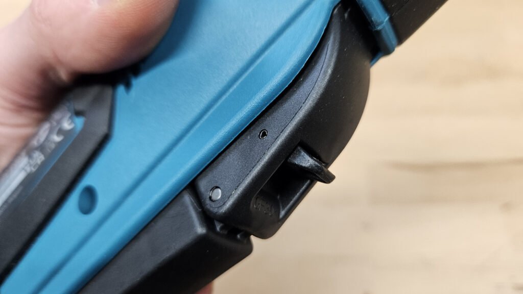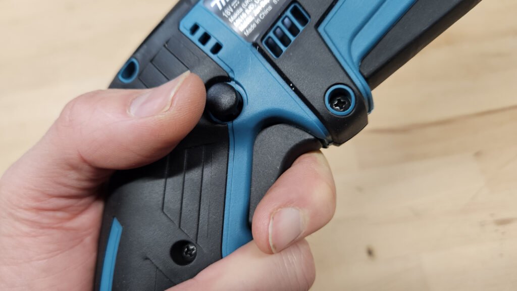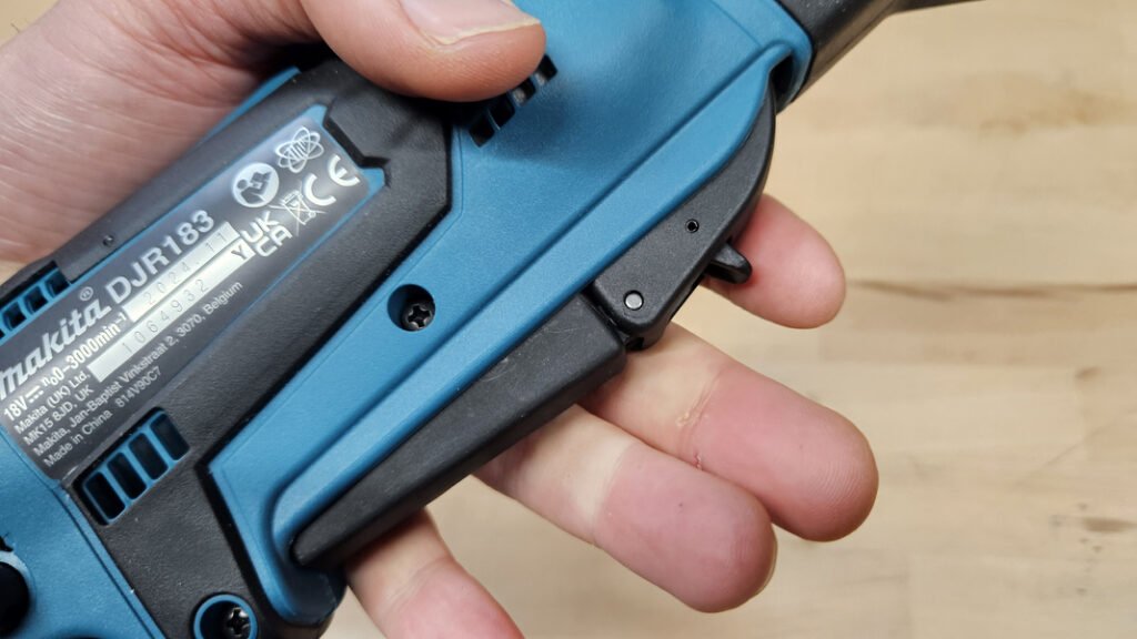 Avec environ 1,2 kg sans batterie, la DJR183Z est facile à manipuler et se prête bien au travail à une main, tout en restant stable à deux mains. La poignée est largement recouverte d’un grip, ce qui améliore l’adhérence, surtout quand on travaille avec des gants ou sur chantier. On retrouve également un bouton de sécurité qui évite les déclenchements involontaires. En usage réel, une partie du poids est “portée” par le support via le sabot et la lame, en appui, la scie se contrôle mieux et la coupe devient plus régulière. La machine n’est pas faite pour la précision d’une scie sauteuse ou circulaire, mais pour une coupe rapide et efficace.