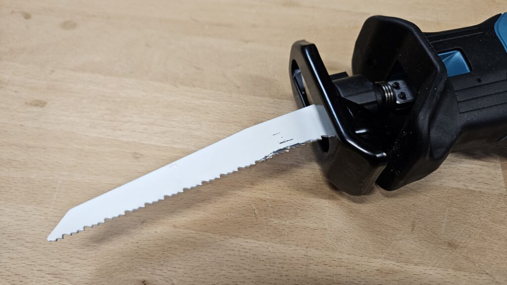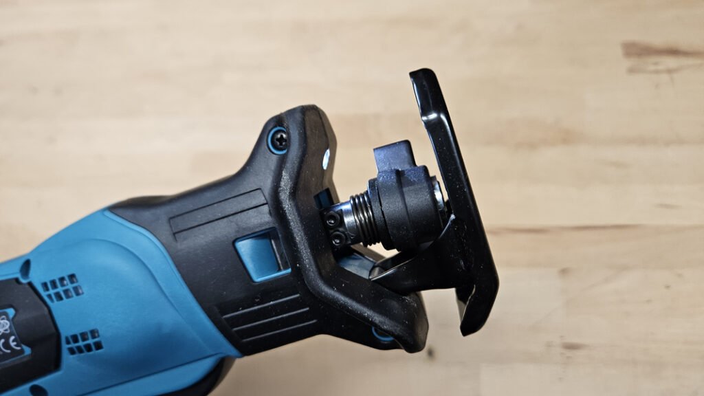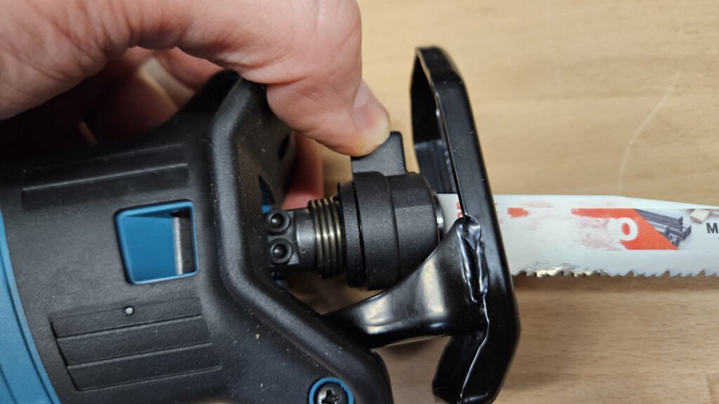 Le changement de lame est rapide grâce au levier de déverrouillage, sans outil. C’est un point important sur une scie sabre, car on alterne souvent entre lames bois, métal ou bi-matériaux. En quelques secondes, la lame est remplacée et on peut repartir sur un autre type de coupe.