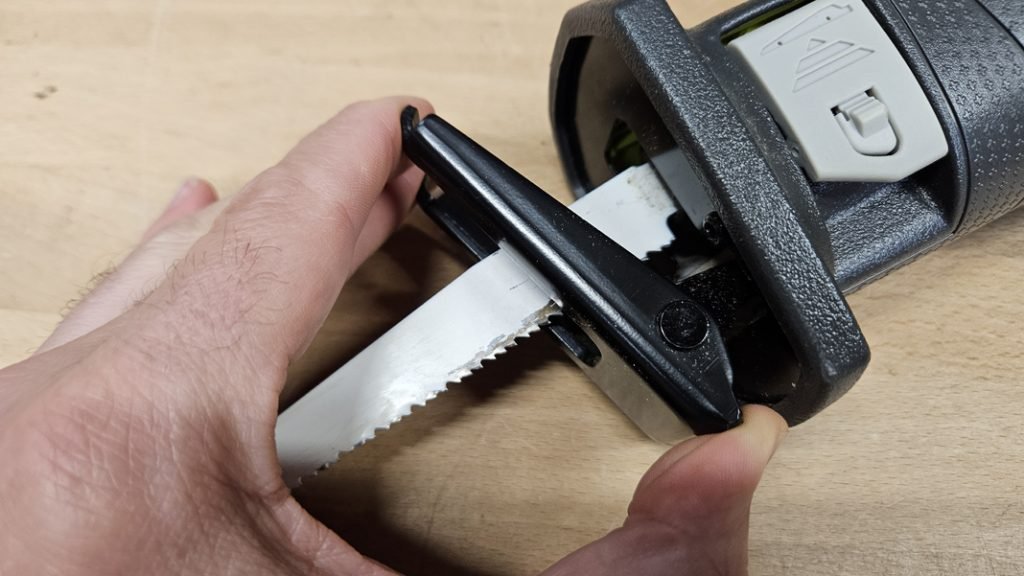 Sur cette scie, le changement de lame se fait sans outil, il suffit en effet de tirer sur le levier, afin de libérer la lame en place et de le rabattre pour bloquer la nouvelle lame.