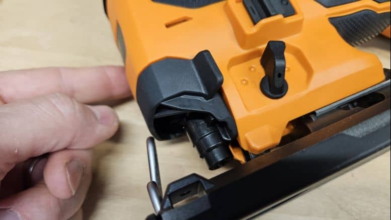Le changement de lame est rapide et sans outil, grâce à un levier à actionner pour éjecter ou insérer la lame. L’outil est fourni avec un conduit d’aspiration à fixer à l’arrière ainsi qu’une lame de scie, de quoi commencer à travailler immédiatement.