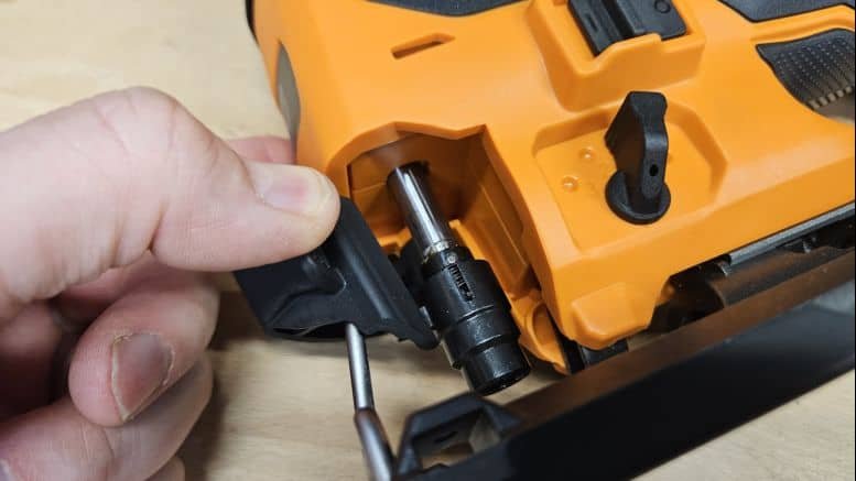 Le changement de lame est rapide et sans outil, grâce à un levier à actionner pour éjecter ou insérer la lame. L’outil est fourni avec un conduit d’aspiration à fixer à l’arrière ainsi qu’une lame de scie, de quoi commencer à travailler immédiatement.