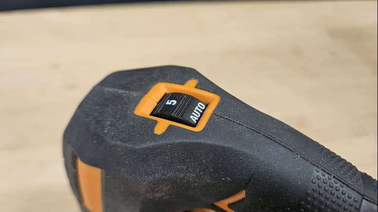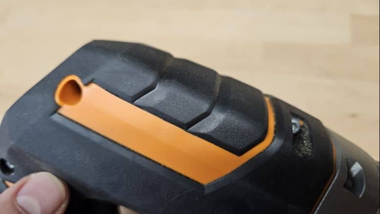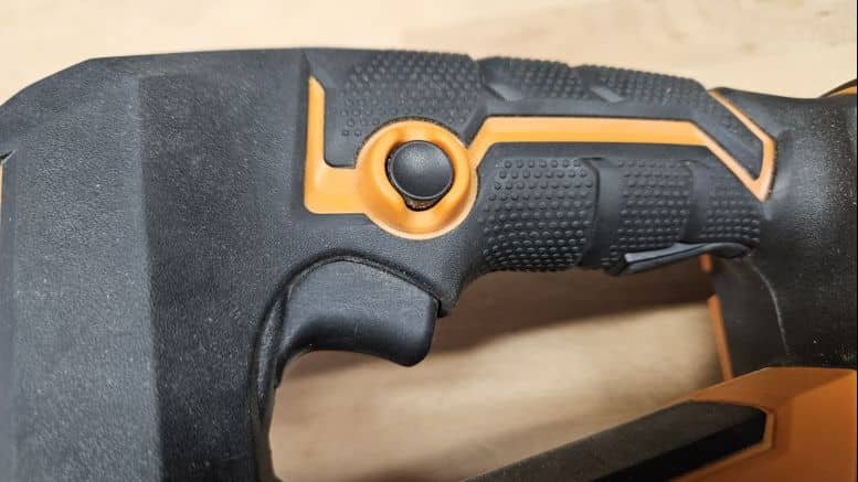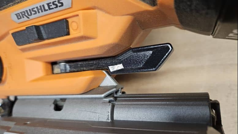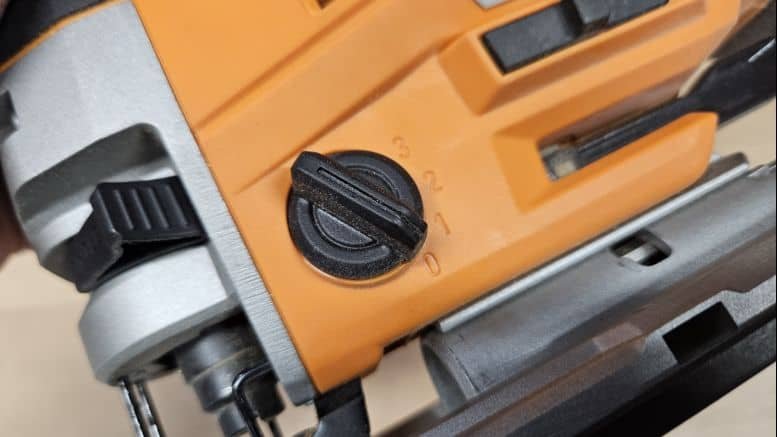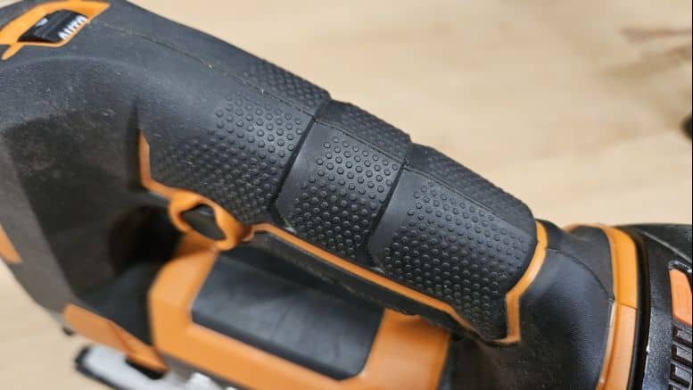 Avec ses 2,1 kg (sans batterie), cette scie sauteuse est un peu plus lourde que la moyenne, mais cela reste acceptable pour une machine posée sur un support. La poignée est bien recouverte de grip antiglisse, y compris sur le pommeau pour un travail à deux mains. La gâchette et les boutons de commande sont bien positionnés, et le verrouillage de la gâchette est un vrai plus pour les coupes longues.