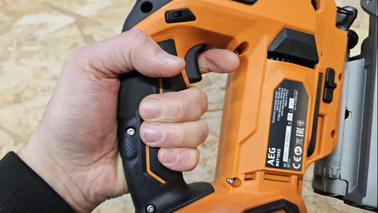 Avec un poids de 1,95 kg (sans batterie), cette scie sauteuse reste dans une moyenne acceptable. Son design en étrier permet une prise en main sûre, et le grip épais apporte une bonne sensation de contrôle. La gâchette et le bouton de sécurité tombent bien sous les doigts, même si ce dernier est un peu éloigné du pouce. Le bouton d’éclairage, placé près du petit doigt, est facilement accessible et améliore la visibilité en zone sombre.