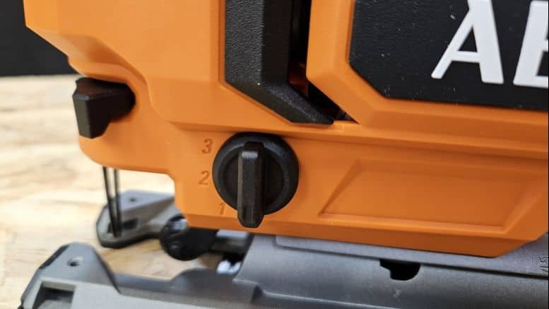 La BST18X2 propose plusieurs réglages utiles pour s’adapter aux situations. Sur le côté, un sélecteur permet d’activer ou désactiver le mouvement pendulaire avec quatre positions. Cela permet d’ajuster la rapidité et l’agressivité de la coupe selon le matériau.