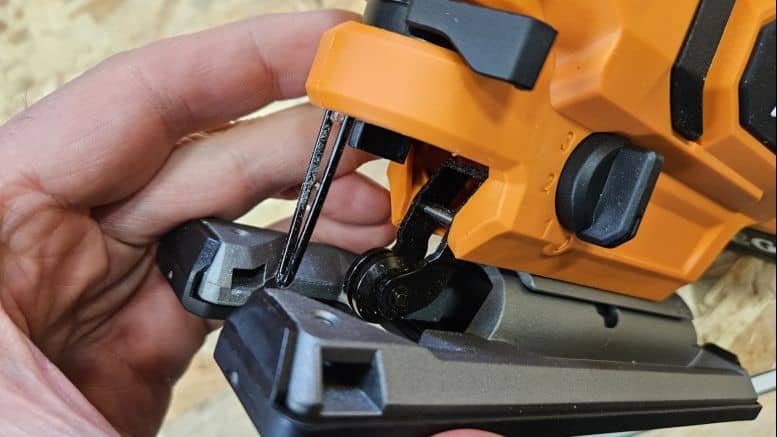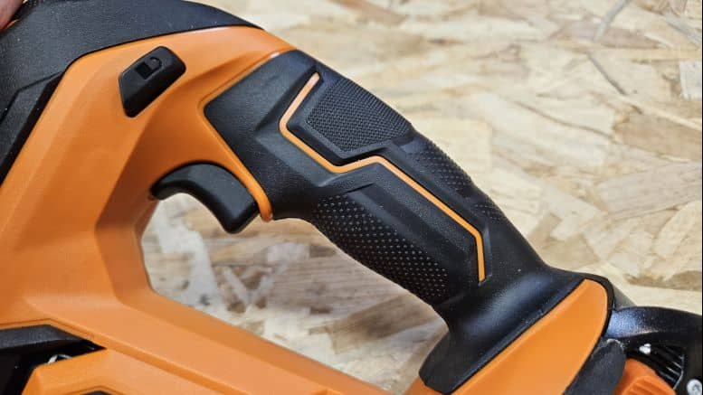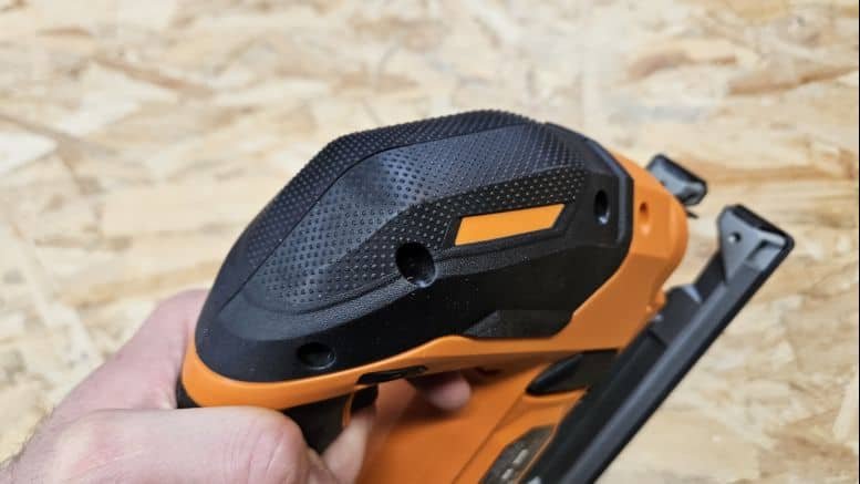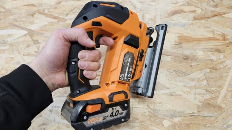 Avec un poids de 1,95 kg (sans batterie), cette scie sauteuse reste dans une moyenne acceptable. Son design en étrier permet une prise en main sûre, et le grip épais apporte une bonne sensation de contrôle. La gâchette et le bouton de sécurité tombent bien sous les doigts, même si ce dernier est un peu éloigné du pouce. Le bouton d’éclairage, placé près du petit doigt, est facilement accessible et améliore la visibilité en zone sombre.