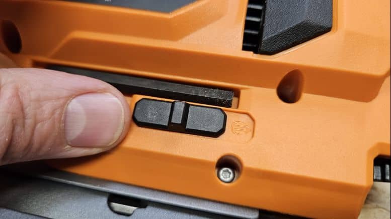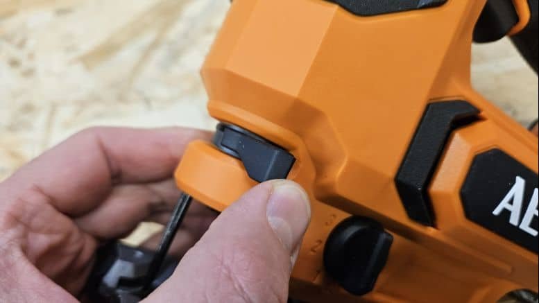 Un second bouton active la soufflerie, qui dégage la ligne de coupe pour une meilleure visibilité. Enfin, l’angle de la semelle peut être réglé sans difficulté grâce à une clé six pans intégrée. Les encoches prédéfinies à 0 et 45° facilitent les ajustements rapides.