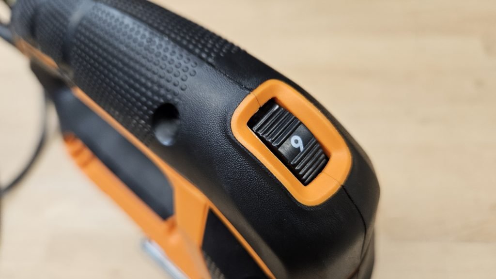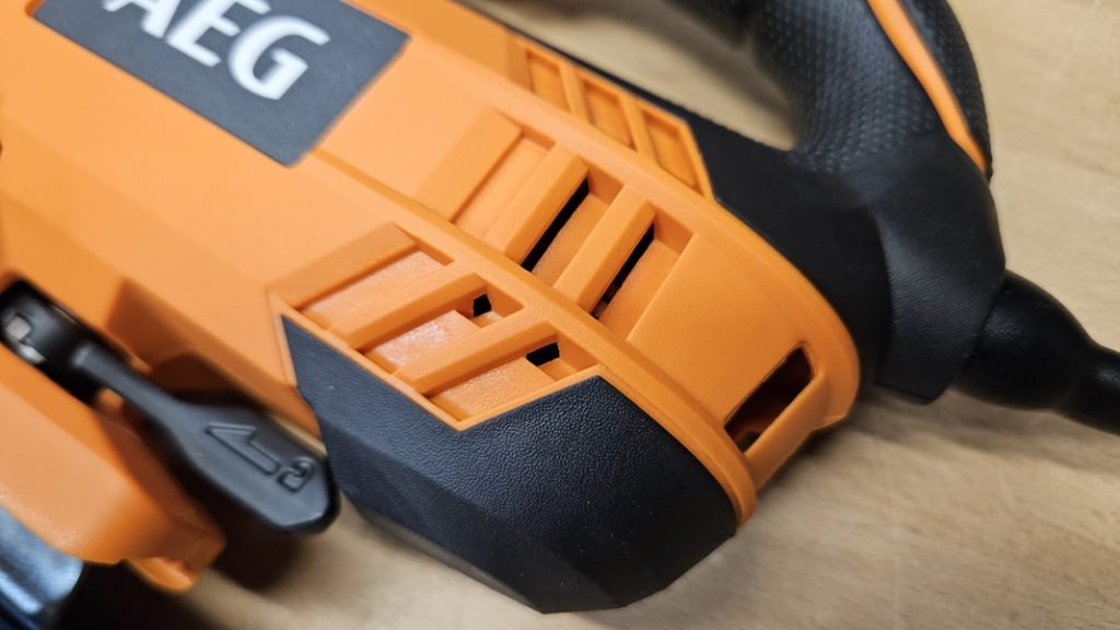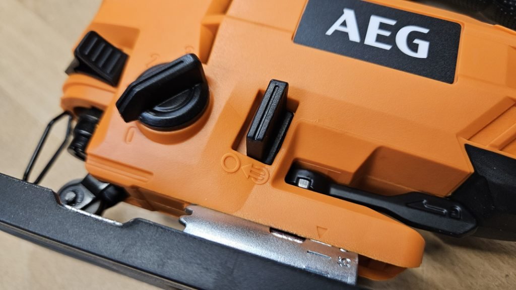 AEG a intégré plusieurs réglages pratiques, avec notamment un variateur de vitesse, une fonction soufflerie activable ou désactivable, et une semelle orientable jusqu’à ±45°. Le levier de réglage de la semelle est de plus assez large et robuste, rendant le changement d’angle simple et rapide. Cette polyvalence permet de réaliser aussi bien des coupes droites que des coupes en biais sans effort.