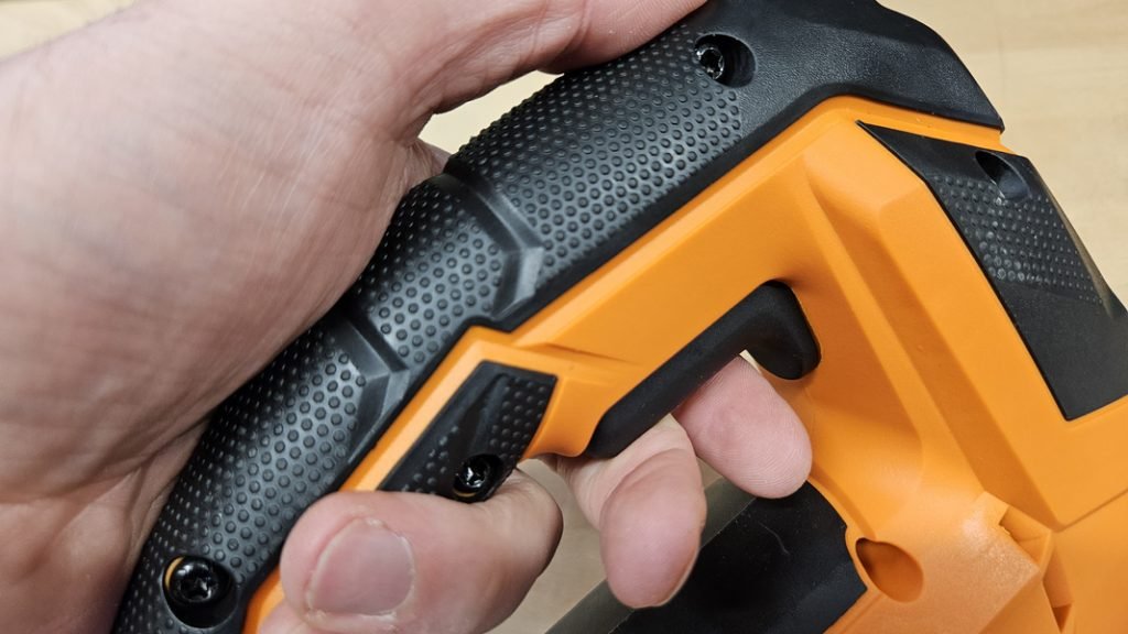 Avec ses 2,6 kg, la scie sauteuse AEG n’est pas la plus légère du marché, mais sa poignée large et son revêtement grip offrent une tenue confortable. Le centre de gravité est bien placé et le bouton de verrouillage de la gâchette limite la fatigue lors des découpes longues. Globalement, la machine reste très stable et agréable à utiliser.