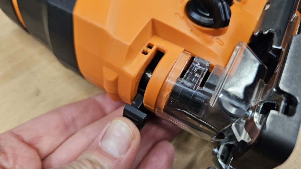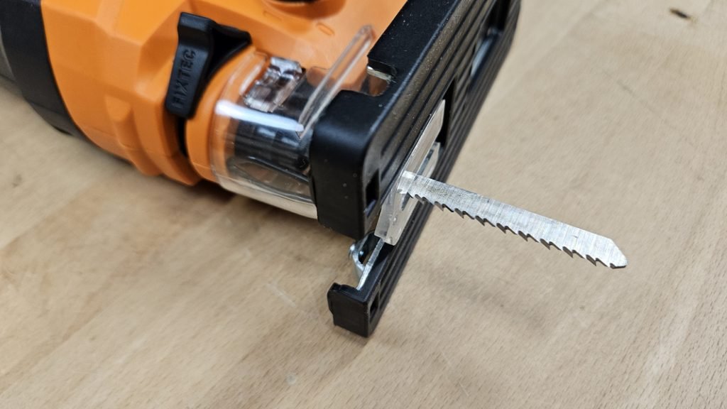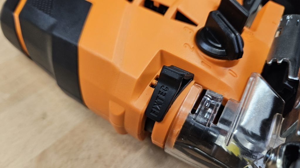 Le système de changement de lame sans outil est l’un des points forts de cette scie sauteuse. Il suffit en effet d’actionner le levier pour éjecter la lame et la remplacer en quelques secondes, même avec des gants. La machine est également équipée d’un capot de protection et d’un pare-éclat pour un meilleur confort visuel.