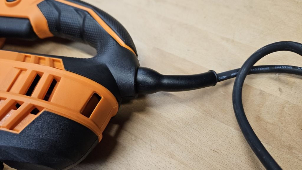 Ce modèle étant filaire, il n’est pas limité par l’autonomie. Le câble de 4 mètres assure quant à lui une bonne liberté de mouvement, que ce soit en atelier ou sur chantier. Le renfort à la base du câble évite les risques de coupure, un point souvent négligé sur les scies sauteuses d’entrée de gamme.