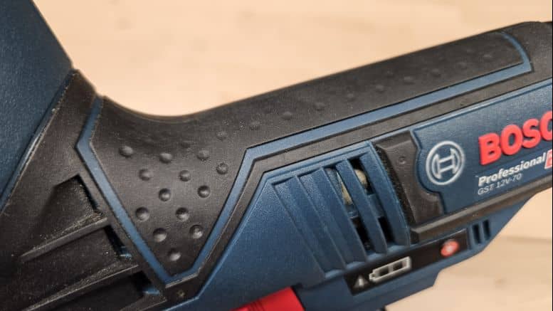 Avec un poids de seulement 1,36 kg (sans batterie), la scie GST 12V-70 se manipule aisément. Son format à pommeau, associé à une poignée fine et bien texturée, garantit un excellent contrôle, même en coupe inversée. L’absence de gâchette au profit d’un bouton marche/arrêt unique améliore le confort en réduisant la fatigue lors d’usages prolongés.