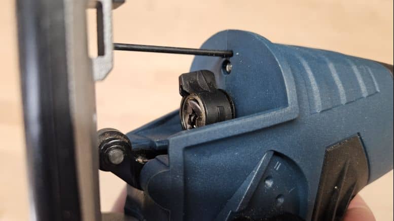 Le changement de lame se fait sans outil : il suffit d’insérer la lame jusqu’à la butée pour qu’elle s’enclenche automatiquement. Pour la retirer, un levier situé sur le flanc éjecte la lame en toute sécurité. Un système simple et efficace, idéal pour enchaîner rapidement les coupes avec différents types de lames.