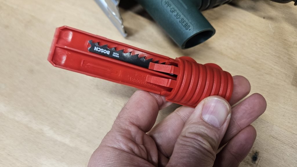 Bosch a intégré sur ce modèle le système SDS, un mécanisme sans outil particulièrement pratique. Il suffit d’insérer la lame jusqu’à butée pour qu’elle se verrouille automatiquement. Le retrait se fait aussi simplement, puisqu’il suffit de tirer sur le levier prévu à cet effet. Ce dispositif rapide, fiable et sécurisé facilite grandement le changement de lame, notamment lors d’enchaînements de coupes sur différents matériaux.