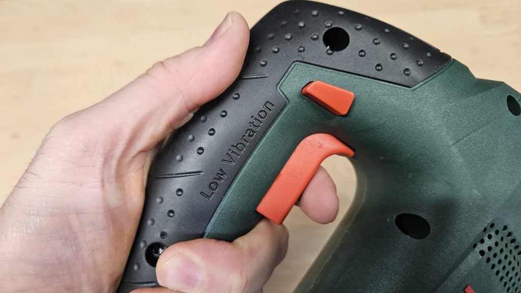 La prise en main de cette scie est très agréable grâce notamment à un grip qui recouvre la poignée principale. La gâchette large se manie aussi bien à un doigt qu’à deux, et un bouton de verrouillage permet de maintenir la machine en marche lors des longues découpes, évitant ainsi la fatigue de la main. Malgré son poids modéré, la scie reste stable et se guide facilement, puisque c’est le support qui porte l’essentiel de la charge, pas l’utilisateur.